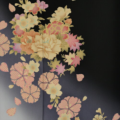 ■0532-39-7660 標準サイズ 身長・・・155cm〜160cm位 洋服サイズ・・・7号〜11号位まで 商品説明 黒地をベースに前身頃をブルーグレーに染め分け四季のお花が描かれた人気モデル「押切もえ」デザインの訪問着です。